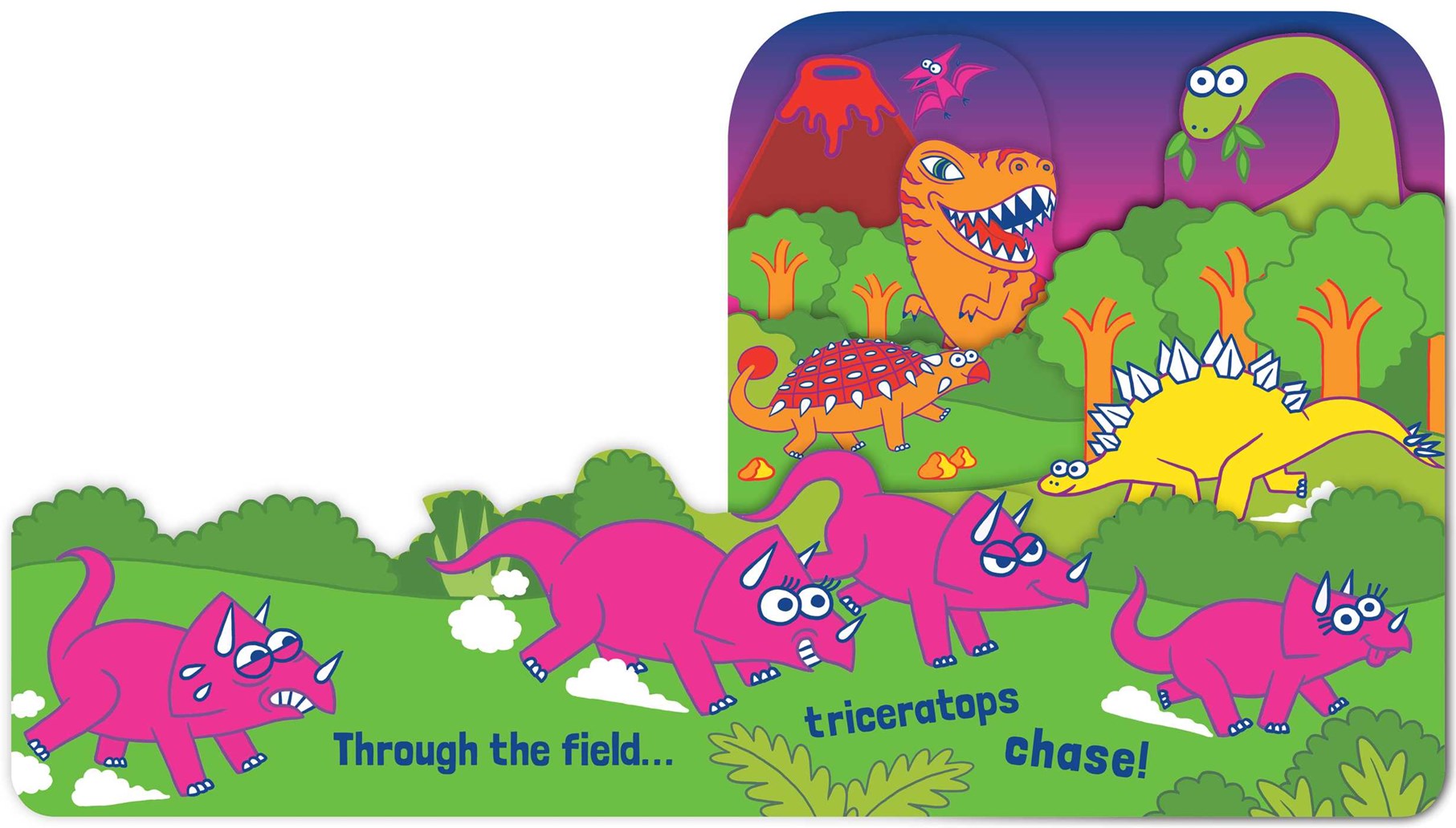 A unique shaped bedtime board book with bright, fluorescent images of all sorts of dinos!